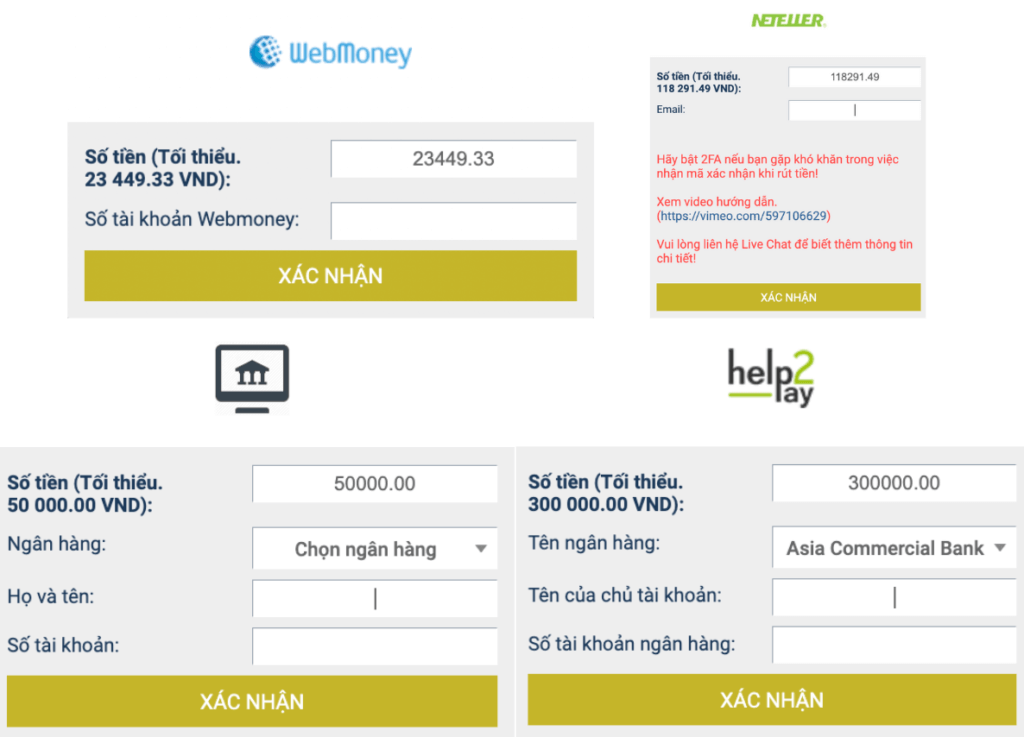 | Neteller | 118.000 | 50.000.000 | Ngay lập tức | Ngay lập tức |